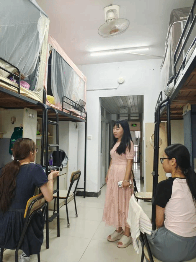 柳晨晨副院长走访专科生寝室,亲切询问报到流程与行李安置情况,就新生对学前教育专业的疑问进行现场解答,简要介绍培养目标与核心课程。她强调安全纪律,提醒大家严禁使用违规电器,注意个人财物保管。