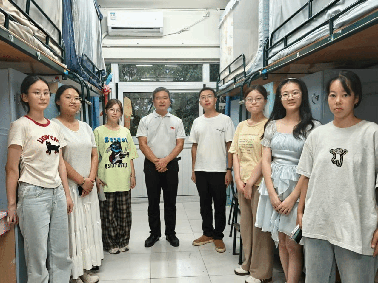 李长吉院长在C区综合楼研究生宿舍,引导新生依次自我介绍,细致询问大家对学校环境、寝室条件的感受,耐心了解生活作息适应情况,并围绕专业认知、研究方向、学业规划等与新生深入交流。他鼓励大家尽快适应研究生阶段自主学习、专注科研的学习模式,将目标落实于日常。