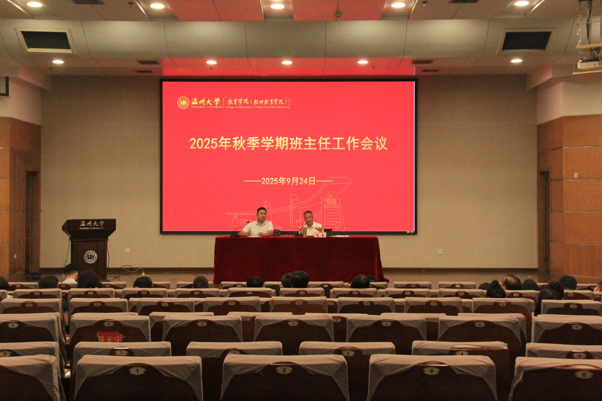 9月24日下午,教育学院在北校信息楼报告厅召开2025年秋季学期期初班主任工作会议。学院领导班子全体成员、全体班主任以及辅导员参加会议。学院党委副书记兼纪委书记章志图主持会议。
