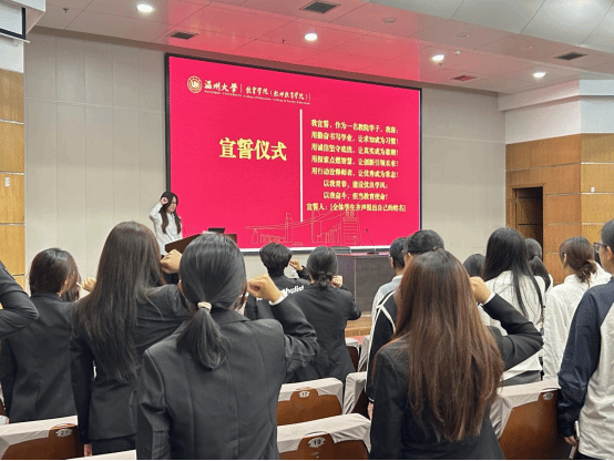 25级新生代表温同学以“以青春之名,赴学风之约”为主题发言,郑重承诺:”我们将恪守学术规范,拒绝投机取巧;保持求知热情,主动向学向上;珍惜课堂时光,尊重知识价值。” 随后,她带领全体参会学生进行学风建设宣誓——“用勤奋书写学业,让求知成为习惯!用诚信坚守底线,让真实成为准则!用探索点燃智慧,让创新引领未来!用行动诠释师表,让优秀成为常态!” 全体学生举起右拳,誓言铿锵,青春的脸庞上写满坚定。这一幕生动诠释了永利23411“以学生为主体,以实干为路径”的学风建设理念,与学院改革试点中”学生自主发展、师生共同成长”的目标高度契合。