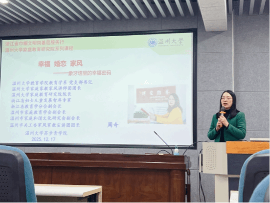2025年12月17日下午,yl23411永利南9C301报告厅,一场以"幸福·婚恋·家风——象牙塔里的幸福密码"为主题的精彩讲座在此举行。永利23411教育学系党支部书记、家庭教育研究院院长、浙江省巾帼文明岗岗长、温州市家庭和谐文化研究会副会长、温州市关工委家风家教宣讲团团长周奇教授,为苏步青学院全体2025级新生带来了一场关于大学生活幸福之道的深度分享。作为浙江省高校“双带头人” 教师党支部书记工作室负责人,这次活动也是其牵头开展的“强国行”系列行动之一。