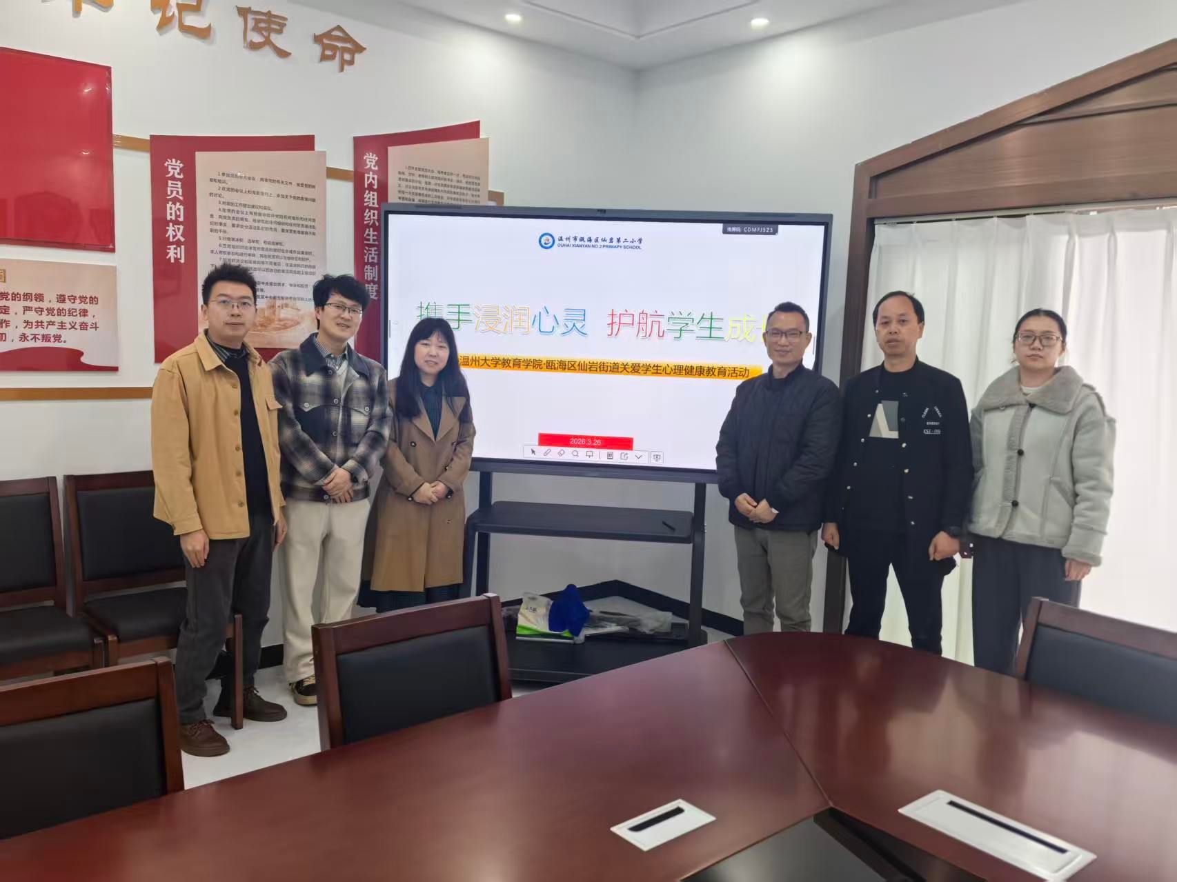 在仙岩二小,付朝静校长介绍学校办学情况,并就心理问题学生团体辅导、教师心理调适、家庭教育培训等表达需求。章园园副书记介绍我院心理学系师资情况、研究生党支部作用发挥和社会心理服务工作,杜健博士围绕双方合作意愿内容进行分析,对该校心理健康工作提出建议。