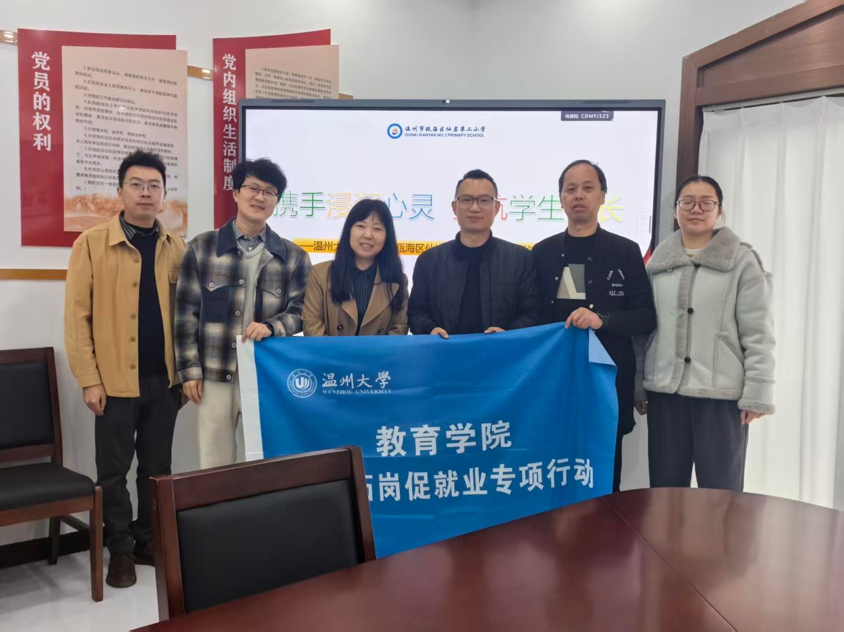 为深入贯彻落实教育部“访企拓岗促就业”专项行动,进一步开拓就业市场,3月26日,永利23411党委副书记章园园、心理学系书记杜健、团委副书记孟江龙一行,前往温州市瓯海区仙岩第二小学开展访企拓岗,受到了对方欢迎与热情接待。