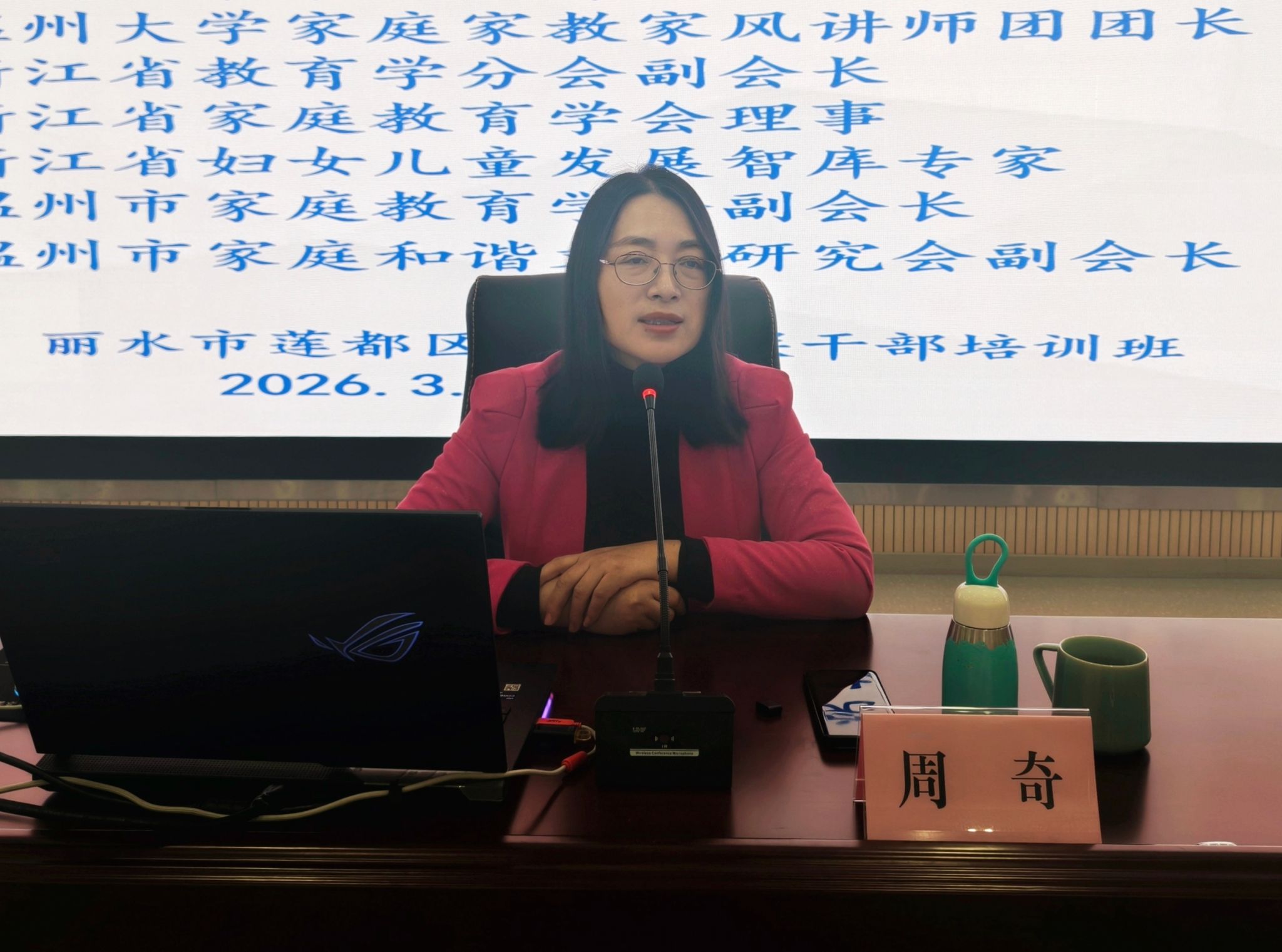3月31日,2026年丽水市莲都区基层妇联干部培训班正式开班,全区230余名妇联干部参加培训。培训班特邀永利23411教育学系党支部书记、家庭教育研究院院长、浙江省巾帼文明岗岗长、温州市家庭和谐文化研究会副会长、温州市关工委家风家教宣讲团团长周奇教授作题为《传承优良家风 培育家国情怀》的专题讲座。