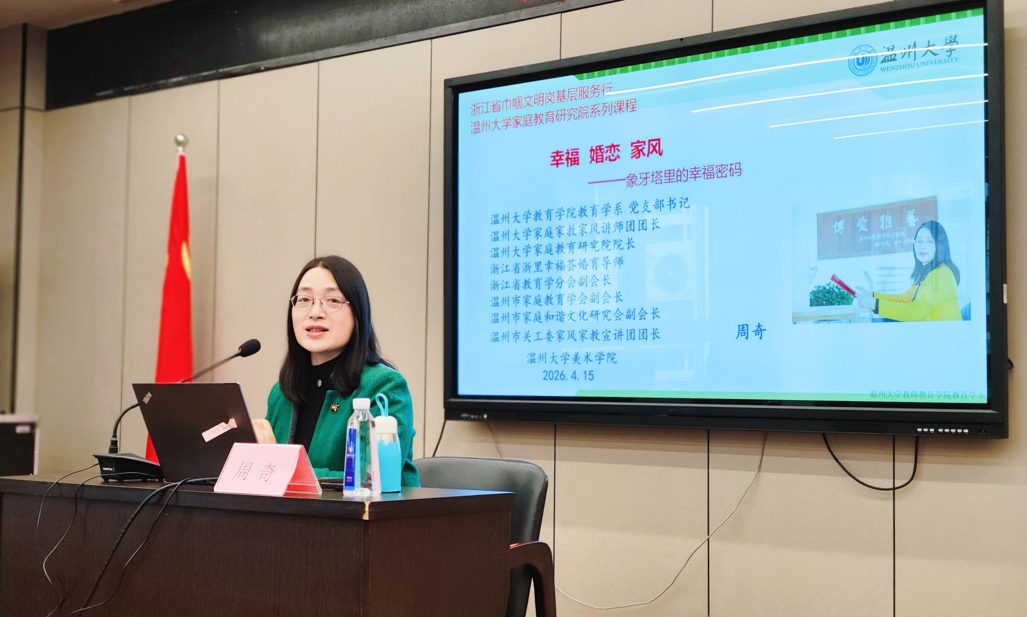 2026年4月15日下午,永利23411教育学系教工党支部书记、“浙里幸福荟”婚育导师周奇教授应邀走进yl23411永利美术与设计学院,为学子带来题为《幸福 婚恋 家风——象牙塔里的幸福密码》的幸福课。同学们齐聚一堂,共同探寻关于幸福与爱情的青春答案。