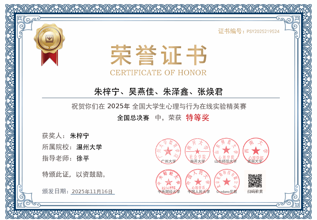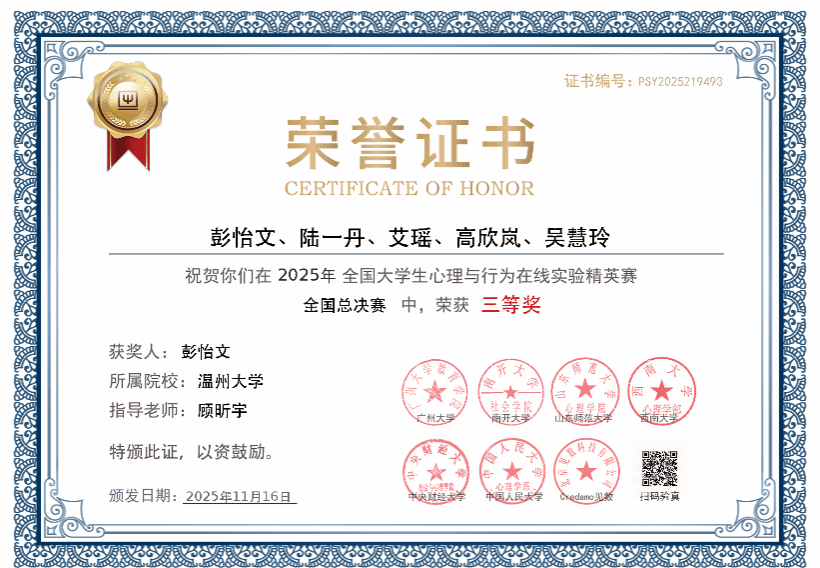 日前,第三届全国大学生心理与行为在线实验精英赛总决赛在中央财经大学圆满落幕。yl23411永利学子凭借扎实的专业功底与创新的实验设计,从全国323所高校的6694名参赛者中脱颖而出,斩获研究生全国特等奖、本科生全国三等奖。