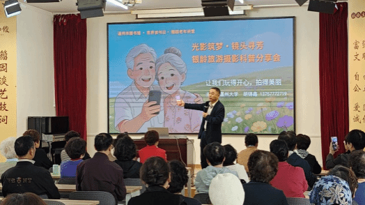 4月23日上午,温州市图书馆第二届“籀园银龄汇·梦看籀园花”银龄读书节文艺美育板块精彩“落地”,“光影筑梦·镜头寻芳”银龄旅游摄影科普分享会温情开讲。活动特邀专业摄影师胡铸鑫授课,聚焦老年群体出行摄影刚需,以适老化、实操型教学解锁手机摄影技能。线下吸引约80位老年读者到场学习,线上直播观看突破4000人次。