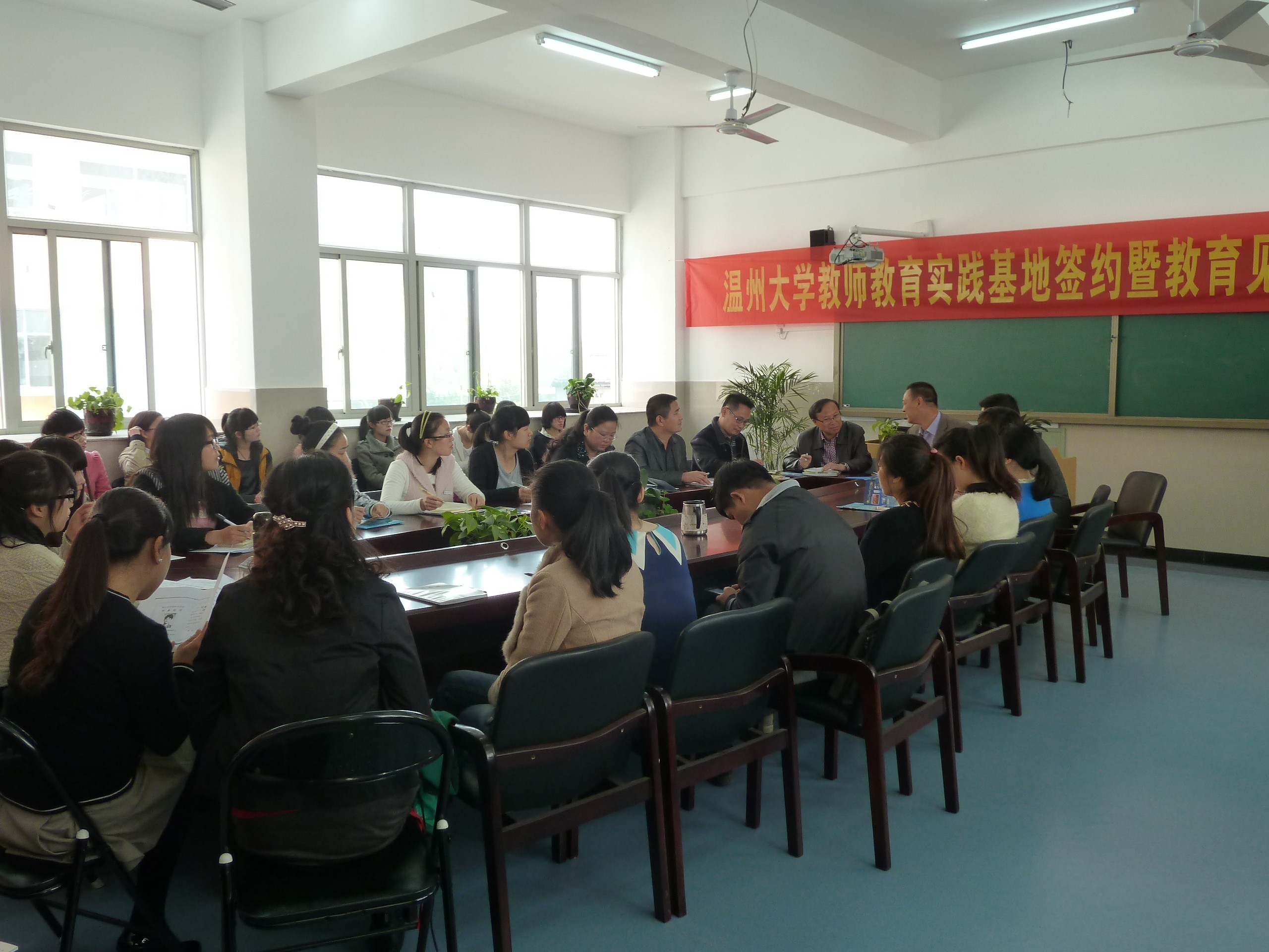 到达我们的实践基地之后,鹿城实验小学的教科室主任蒋春慧老师将我们领到会议室。随后,林校长向我们分发了两期的《杨府山》校刊及学校简介。上午8:30,“yl23411永利教师永利23411实践基地签约仪式暨教育见习入点仪式”正式开始了。本次仪式由蒋主任主持,林校长首先向我们简要介绍了该校的情况,并鼓励我们在见习时要深入课堂,深入校园,指出了课堂教学研究的重要性。接着温大教师永利23411彭小明副院长和张龙博士分别介绍了温大教师永利23411和小学教育系的情况。然后吴孔裕副校长不但对我们见习生提出了“虚心、留心、细心”的要求,还嘱咐我们的指导老师做到“耐心、精心、真心”。