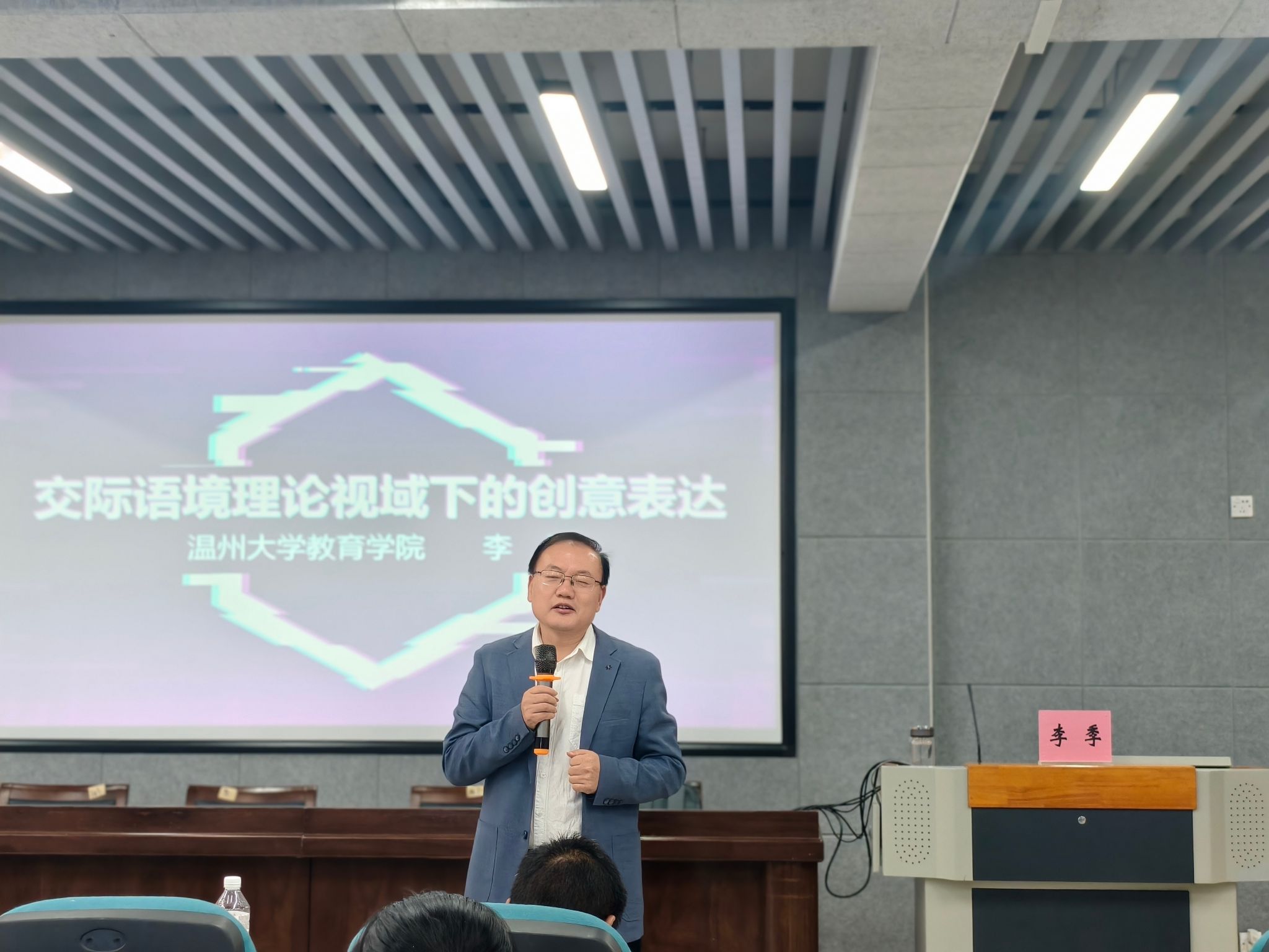 下午,永利23411李季博士以《交际语境理论视域下的创意表达》为题开讲,从写作作为作品、写作作为过程、写作作为交流三大核心视角切入,结合交际语境要素,深度阐释创意表达教学的实践路径。