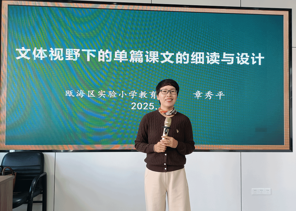 培训第二天,温州市特级教师章秀平副校长以“文本视野下的单篇课文的细读与设计”为题,强调了以“文本-学生-教师”的三角关系为核心的内容,清晰梳理了单篇课文教学的逻辑:首先,她强调合适的学习内容必须双维锚定——既贴合文本体式,又匹配学情;接着,从三个角度拆解“细读”的路径,即读者视角重文本本身的情感与内容感知,学生视角关注学生的理解边界与兴趣点,教师视角则聚焦专业挖掘文本的教学价值,最终实现“基于文本、指向学生、通过教师”的单篇课文有效设计。